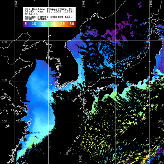 o 2005년 03월 14일 02시 43분 NOAA-16호 위성영상입니다. o 수온분포는 범례를 참고하시기 바랍니다. o 검은색은 구름 또는 육지를 나타냅니다.