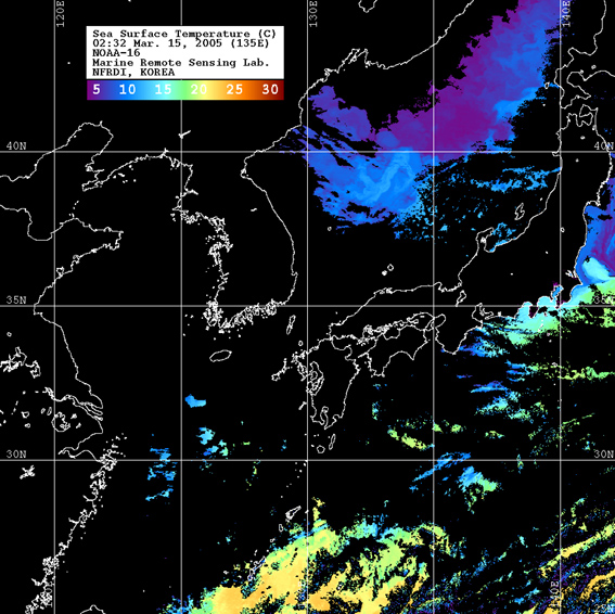 o 2005년 03월 15일 02시 32분 NOAA-16호 위성영상입니다. o 수온분포는 범례를 참고하시기 바랍니다. o 검은색은 구름 또는 육지를 나타냅니다.