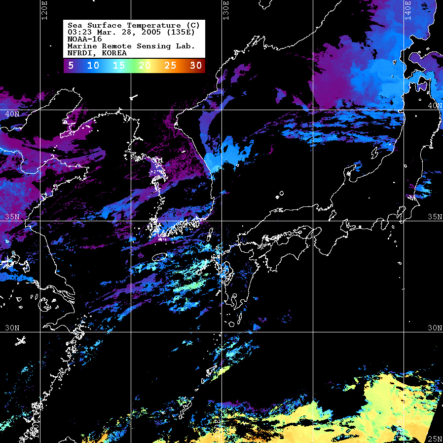 o 2005년 03월 28일 03시 23분 NOAA-16호 위성영상입니다. o 수온분포는 범례를 참고하시기 바랍니다. o 검은색은 구름 또는 육지를 나타냅니다.