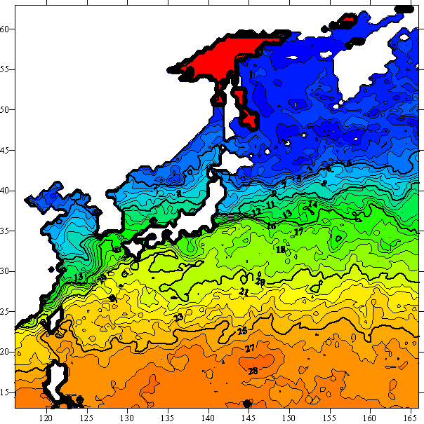 o 2005년 03월 25일 북서태평양 광역해양 수온분포 입니다.