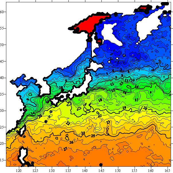 o 2005년 03월 27일 북서태평양 광역해양 수온분포 입니다.