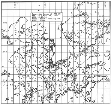 o 금주 (2005.03.22∼03.28)의 한국근해 표면수온은 대화퇴 근해 섭씨 6∼8도, 울릉도 근해 9∼11도, 대마도 근해 14∼15도, 제주도 근해 13∼16도, 이어도 근해 8∼10도, 일향초 근해 9∼11도, 어청도 근해 4∼5도 내외로 나타납니다. o 「평년에 비해」수온은 대화퇴 근해 1도 낮게, 울릉도 근해 비슷하게, 대마도 근해 0.5도 높게, 제주도 근해 비슷하게, 이어도 근해 0.5도 낮게, 일향초 근해 1도 높게, 어청도 근해는 1도 낮게 나타납니다. o 수온 전선대는 제주해협∼대한해협 서수도에서 수온 13도 및 주문진∼울릉도 간해역에서 수온10도를 중심으로 형성됩니다. < 위의 그림을 클릭하시면 확대된 수온정보를 보실 수 있습니다 >
