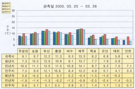 o 금주(2005.03.20∼03.26)의 한반도 연안 표면수온은 동해 연안역에서 섭씨 8∼9.5도, 남해 연안역에서 9.5∼13.5도, 서해 연안역에서 4∼7도 내외로 나타납니다.