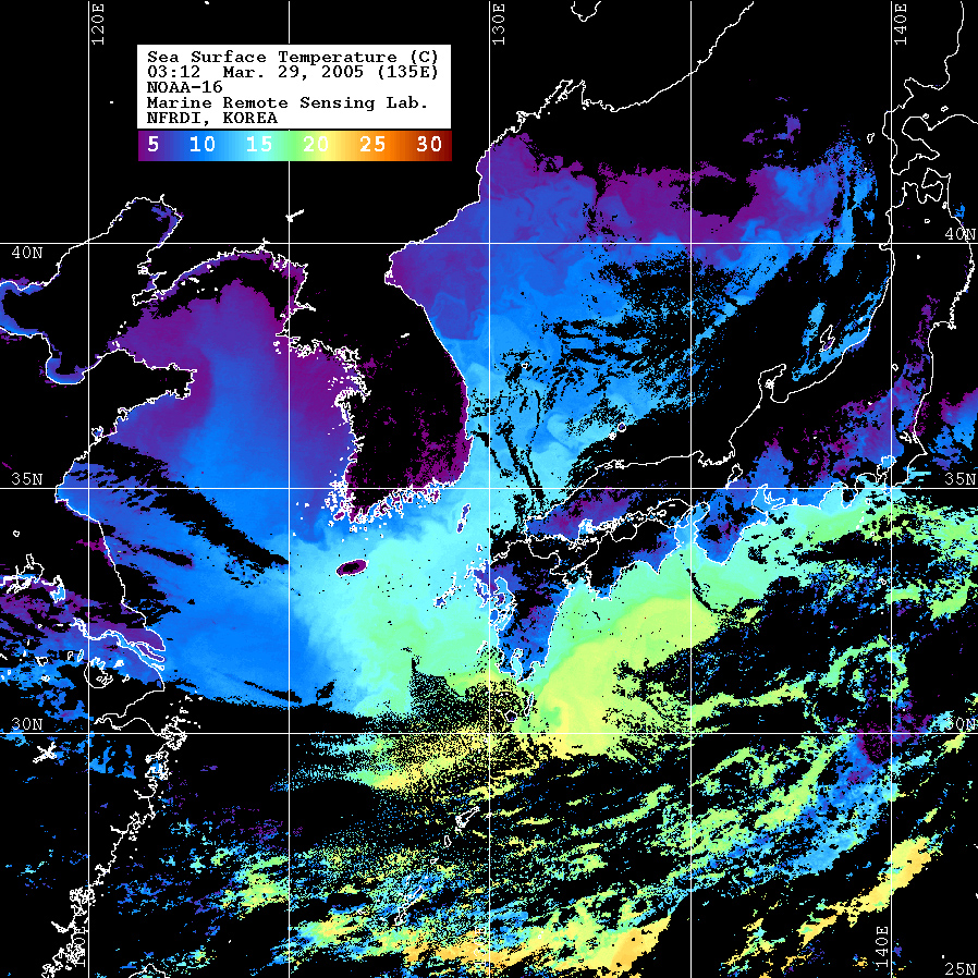 o 2005년 03월 29일 03시 12분 NOAA-16호 위성영상입니다. o 수온분포는 범례를 참고하시기 바랍니다. o 검은색은 구름 또는 육지를 나타냅니다.