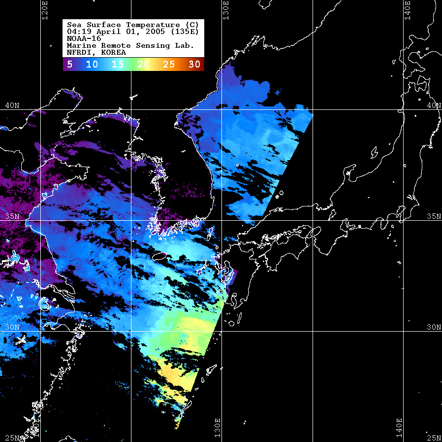o 2005년 04월 01일 04시 19분 NOAA-16호 위성영상입니다. o 수온분포는 범례를 참고하시기 바랍니다. o 검은색은 구름 또는 육지를 나타냅니다.