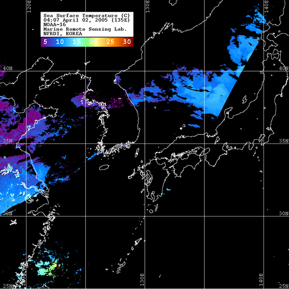 o 2005년 04월 02일 04시 07분 NOAA-16호 위성영상입니다. o 수온분포는 범례를 참고하시기 바랍니다. o 검은색은 구름 또는 육지를 나타냅니다.