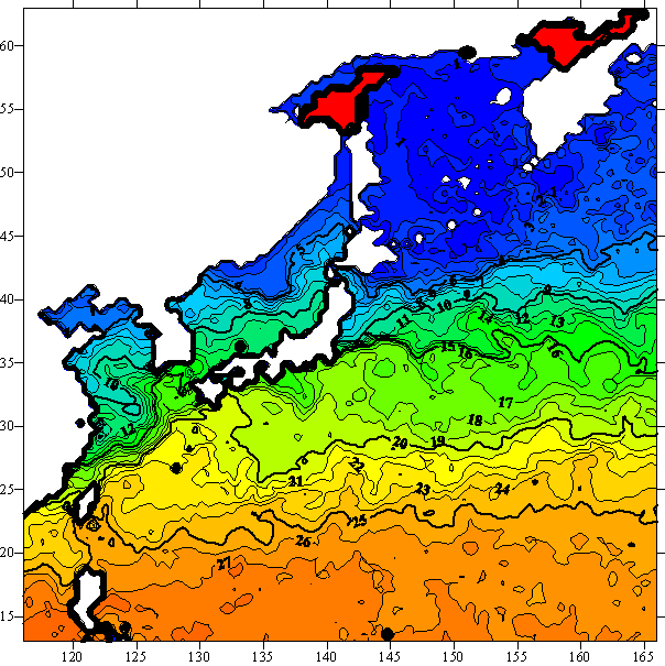 o 2005년 04월 01일 북서태평양 광역해양 수온분포 입니다.