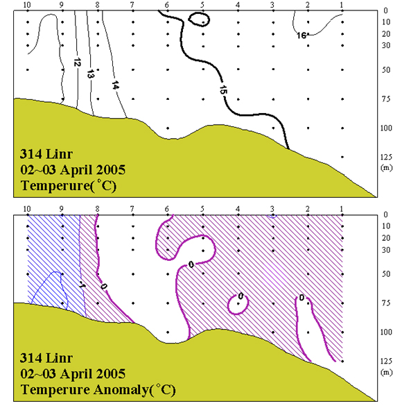 ◦ 2005년 4월 2~3일 국립수산과학원 남해수산연구소에서 조사한 314선(제주 남부해역)의 수직수온분포도 및 평년편차도 입니다.