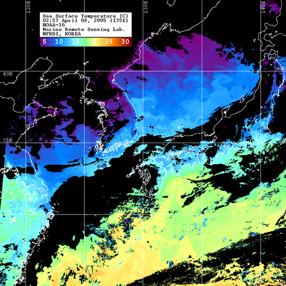 o 2005년 04월 08일 02시 57분 NOAA-16호 위성영상입니다. o 수온분포는 범례를 참고하시기 바랍니다. o 검은색은 구름 또는 육지를 나타냅니다.