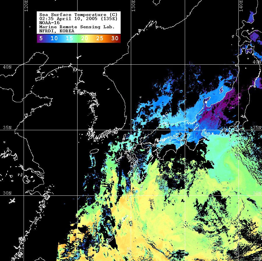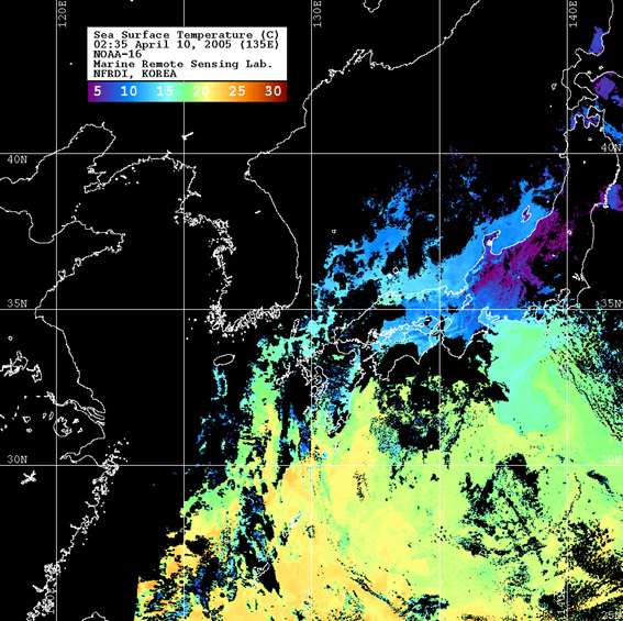 o 2005년 04월 10일 02시 35분 NOAA-16호 위성영상입니다. o 수온분포는 범례를 참고하시기 바랍니다. o 검은색은 구름 또는 육지를 나타냅니다.