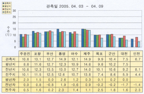 o 금주(2005.04.03∼04.09)의 한반도 연안 표면수온은 동해 연안역에서 섭씨 10.5∼13도, 남해 연안역에서 12∼15도, 서해 연안역에서 6.5∼10.5도 내외로 나타납니다.