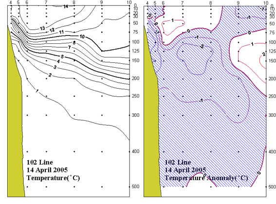 ◦ 2005년 4월 14일 국립수산과학원 동해수산연구소에서 조사한 102선(포항 동방)의 수직수온분포도 및 평년편차도 입니다.