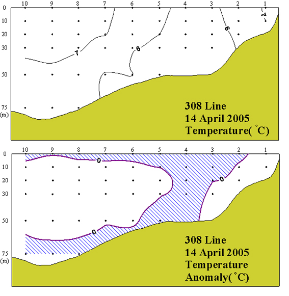 ◦ 2005년 04월 14일 국립수산과학원 서해수산연구소에서 조사한 308선(대천 서방)의 수직수온분포도 및 평년편차도 입니다.