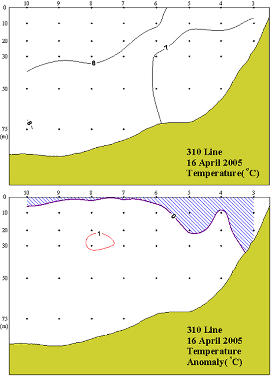 ◦ 2005년 04월 16일 국립수산과학원 서해수산연구소에서 조사한 310선 (영광 서방)의 수직수온분포도 및 평년편차도 입니다.