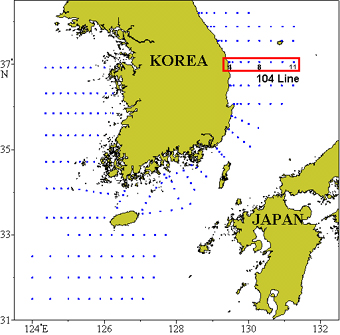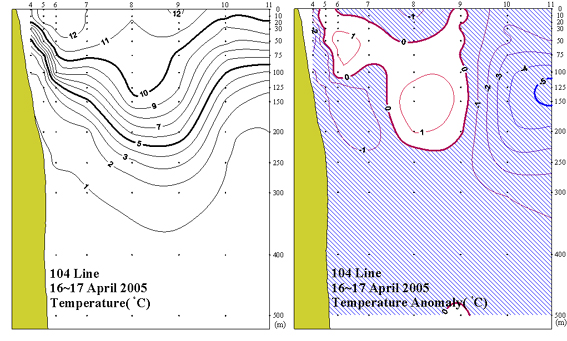 ◦ 2005년 04월 16~17일 국립수산과학원 동해수산연구소에서 조사한 104선(죽변 동방)의 수직수온분포도 및 평년편차도 입니다.