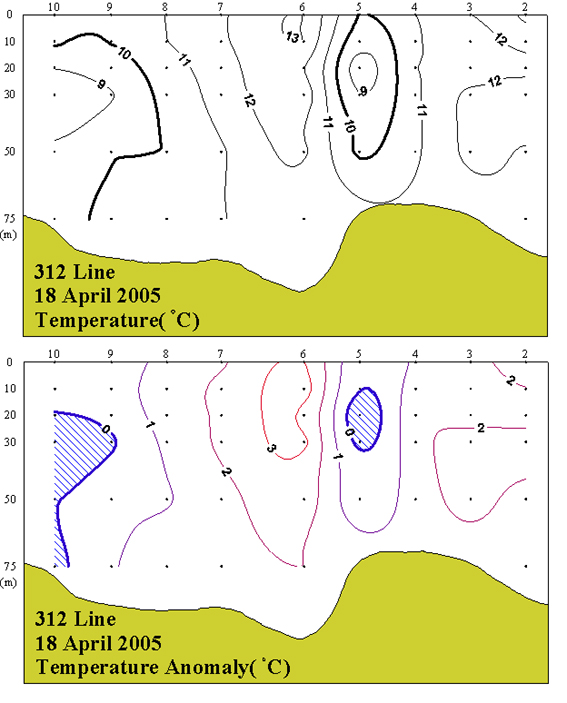 ◦ 2005년 4월 18일 국립수산과학원 서해수산연구소에서 조사한 312선(제주해협 서방)의 수직수온분포도 및 평년편차도 입니다.
