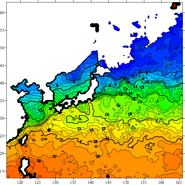 o 2005년 04월 21일 북서태평양 광역해양 수온분포 입니다.