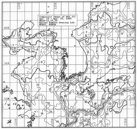 o 금주 (2005.04.19∼04.25)의 한국근해 표면수온은 대화퇴 근해 섭씨 8∼9도, 울릉도 근해 10∼12도, 대마도 근해 14∼16도, 제주도 근해 14∼16도, 이어도 근해 11∼12도, 일향초 근해 11∼12도, 어청도 근해 7∼8도 내외로 나타납니다. o 「평년에 비해」수온은 대화퇴 근해 비슷하게, 울릉도 근해 1.5도 낮게, 대마도 근해 및 제주도 근해 0.5도 낮게, 이어도 근해 비슷하게, 일향초 근해 1도 높게, 어청도 근해는 0.5도 낮게 나타납니다. o 수온 전선대는 이어도 동쪽 100km해상∼제주해협∼대한해협 서수도에서 수온 13도를 중심으로 형성됩니다. < 위의 그림을 클릭하시면 확대된 수온정보를 보실 수 있습니다 >