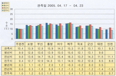 o 금주(2005.04.17∼04.23)의 한반도 연안 표면수온은 동해 연안역에서 섭씨 10.5∼14도, 남해 연안역에서 13∼16도, 서해 연안역에서 9.5∼13도 내외로 나타납니다.