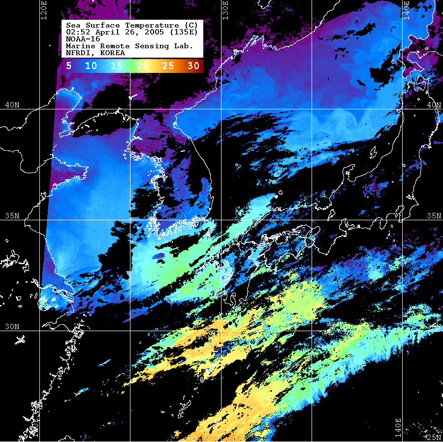 o 2005년 04월 26일 02시 52분 NOAA-16호 위성영상입니다. o 수온분포는 범례를 참고하시기 바랍니다. o 검은색은 구름 또는 육지를 나타냅니다.