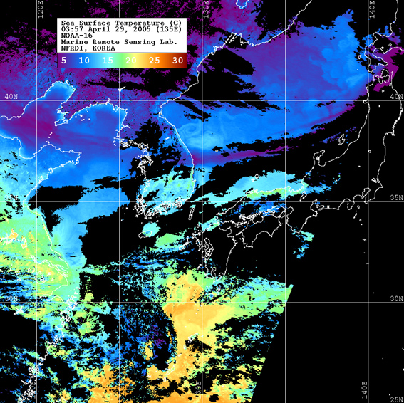 o 2005년 04월 29일 03시 57분 NOAA-16호 위성영상입니다. o 수온분포는 범례를 참고하시기 바랍니다. o 검은색은 구름 또는 육지를 나타냅니다.