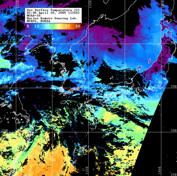 o 2005년 04월 30일 03시 46분 NOAA-16호 위성영상입니다. o 수온분포는 범례를 참고하시기 바랍니다. o 검은색은 구름 또는 육지를 나타냅니다.