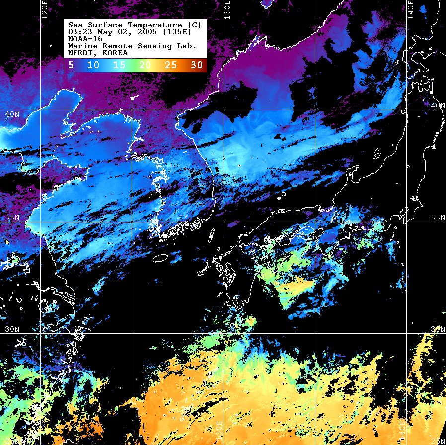 o 2005년 05월 02일 03시 23분 NOAA-16호 위성영상입니다. o 수온분포는 범례를 참고하시기 바랍니다. o 검은색은 구름 또는 육지를 나타냅니다.