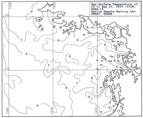 o 아래 그림은 2005년 5월 3일 03시 현재의 위성수온 분포도 입니다.