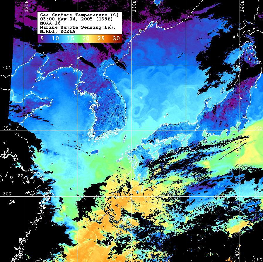 o 2005년 05월 04일 03시 00분 NOAA-16호 위성영상입니다. o 수온분포는 범례를 참고하시기 바랍니다. o 검은색은 구름 또는 육지를 나타냅니다.