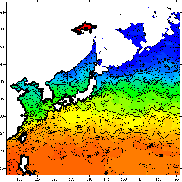 o 아래 위성 수온분포도는 국립수산과학원(NFRDI, Korea)과 일본동북대학교(Tohoku University, Japan)가 공동연구개발 진행중, 1차 연구결과인 것으로 구름의 영향을 배제한 신기술의 수온정보입니다.