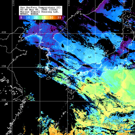 o 2005년 05월 04일 02시 48분 NOAA-16호 위성영상입니다. o 수온분포는 범례를 참고하시기 바랍니다. o 검은색은 구름 또는 육지를 나타냅니다.