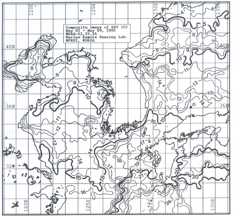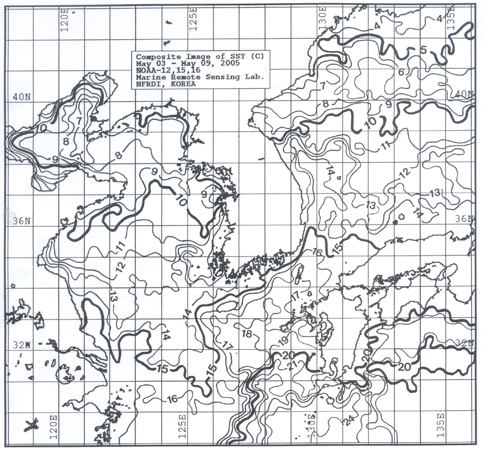 o 금주 (2005.05.03∼05.09)의 한국근해 표면수온은 대화퇴 근해 섭씨 10∼11도, 울릉도 근해 13∼14도, 대마도 근해 16∼18도, 제주도 근해 15∼17도, 이어도 근해 13∼15도, 일향초 근해 13∼14도, 어청도 근해 10∼12도 내외로 나타납니다. o「평년에 비해」수온은 대화퇴 근해 및 울릉도 근해 0.5도 낮게, 대마도 근해 1도 높게, 제주도 근해 0.5도 높게, 이어도 근해 비슷하게, 일향초 근해 및 어청도 근해는 1도 높게 나타납니다. o 수온 전선대는 이어도∼제주해협∼대한해협 서수도에서 수온 15도를 중심으로 형성됩니다. < 위의 그림을 클릭하시면 확대된 수온정보를 보실 수 있습니다 >
