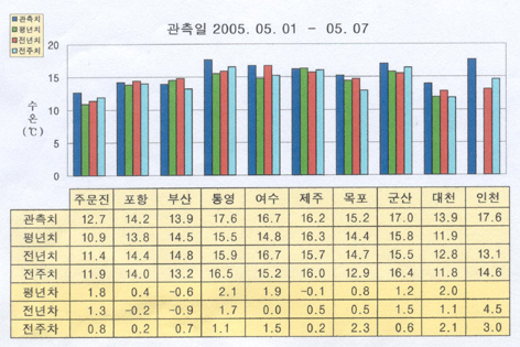 o 금주(2005.05.01∼05.07)의 한반도 연안 표면수온은 동해 연안역에서 섭씨 13∼15도, 남해 연안역에서 14∼18도, 서해 연안역에서 15∼18도 내외로 나타납니다.