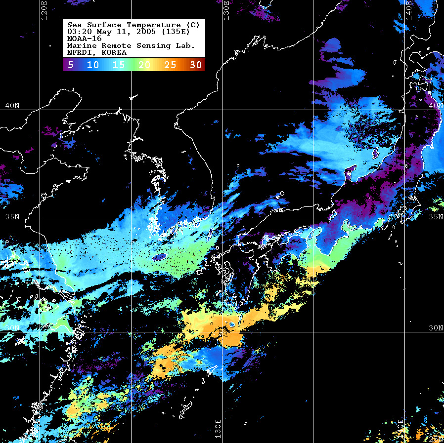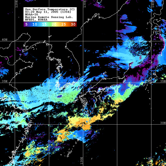 o 2005년 05월 11일 03시 20분 NOAA-16호 위성영상입니다. o 수온분포는 범례를 참고하시기 바랍니다. o 검은색은 구름 또는 육지를 나타냅니다.