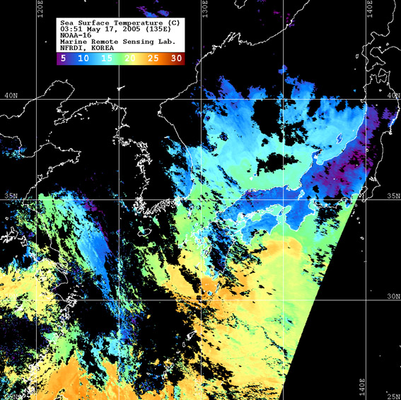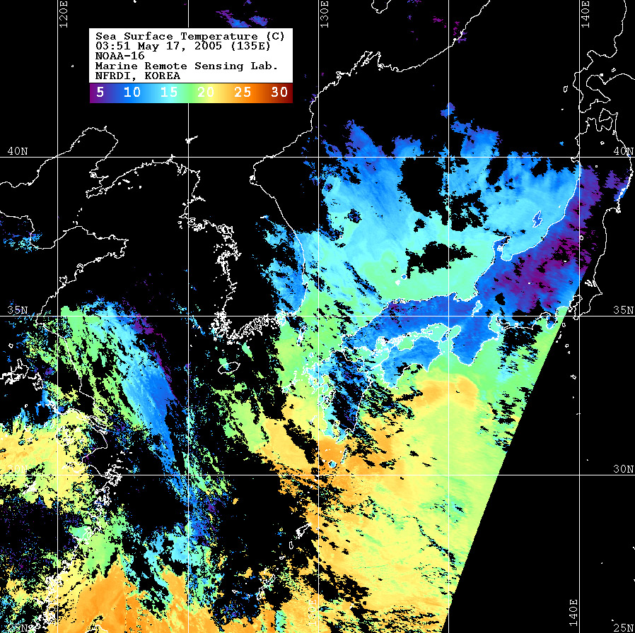 o 2005년 05월 17일 03시 51분 NOAA-16호 위성영상입니다. o 수온분포는 범례를 참고하시기 바랍니다. o 검은색은 구름 또는 육지를 나타냅니다.