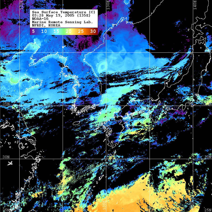 o 2005년 05월 19일 03시 28분 NOAA-16호 위성영상입니다. o 수온분포는 범례를 참고하시기 바랍니다. o 검은색은 구름 또는 육지를 나타냅니다.