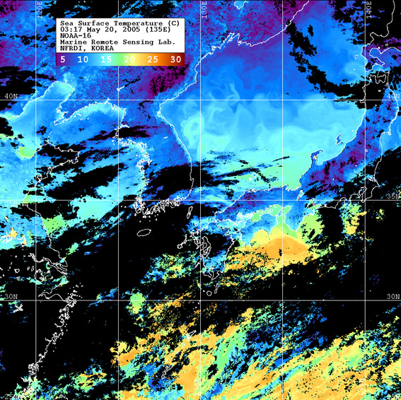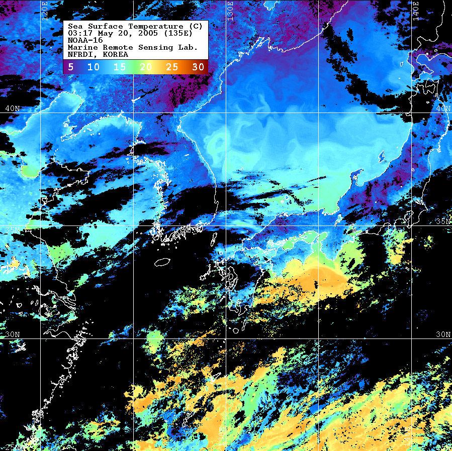 o 2005년 05월 20일 03시 17분 NOAA-16호 위성영상입니다. o 수온분포는 범례를 참고하시기 바랍니다. o 검은색은 구름 또는 육지를 나타냅니다.