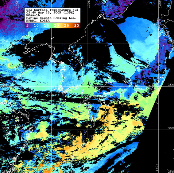o 2005년 05월 26일 03시 48분 NOAA-16호 위성영상입니다. o 수온분포는 범례를 참고하시기 바랍니다. o 검은색은 구름 또는 육지를 나타냅니다.