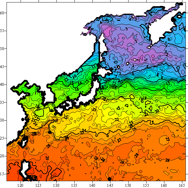 o 2005년 06월 05일 북서태평양 광역해양 수온분포 입니다.