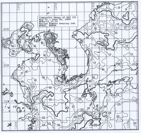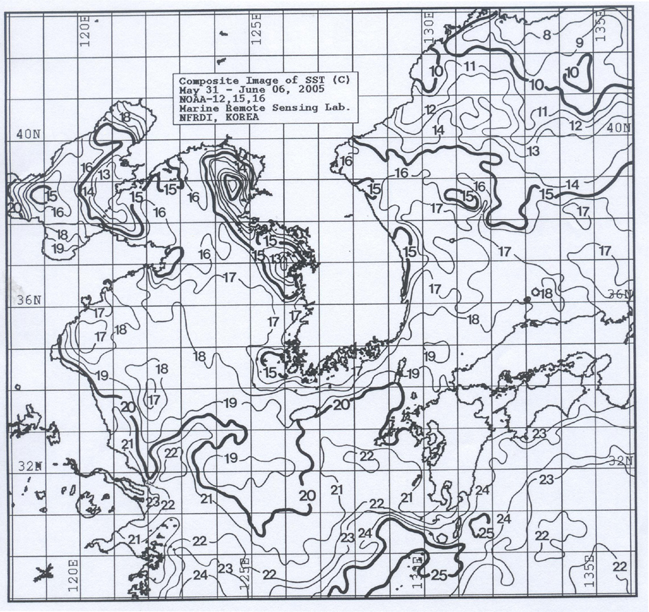 o 금주 (2005.05.31∼06.06)의 한국근해 표면수온은 대화퇴 근해 섭씨 13∼14도, 울릉도 근해 17∼18도, 대마도 근해 19∼20도, 제주도 근해 19∼20도, 이어도 근해 18∼19도, 일향초 근해 17∼18도, 어청도 근해 16∼17도 내외로 나타납니다.