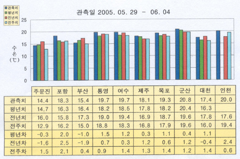 o 금주(2005.05.29∼06.04)의 한반도 연안 표면수온은 동해 연안역에서 섭씨 15∼19도, 남해 연안역에서 17∼20도, 서해 연안역에서 18∼21도 내외로 나타납니다.