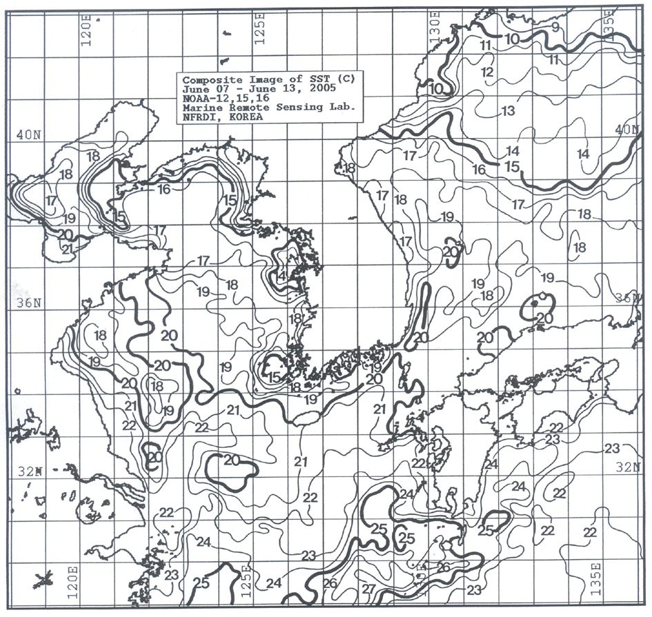 o 금주 (2005.06.07∼06.13)의 한국근해 표면수온은 대화퇴 근해 섭씨 13∼15도, 울릉도 근해 19∼20도, 대마도 근해 20∼21도, 제주도 근해 20∼21도, 이어도 근해 21∼22도, 일향초 근해 18∼19도, 어청도 근해 17∼18도 내외로 나타납니다.