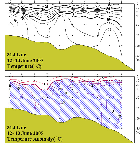 ◦ 2005년 6월 12~13일 국립수산과학원 남해수산연구소에서 조사한 314선(제주 남부해역)의 수직수온분포도 및 평년편차도 입니다.