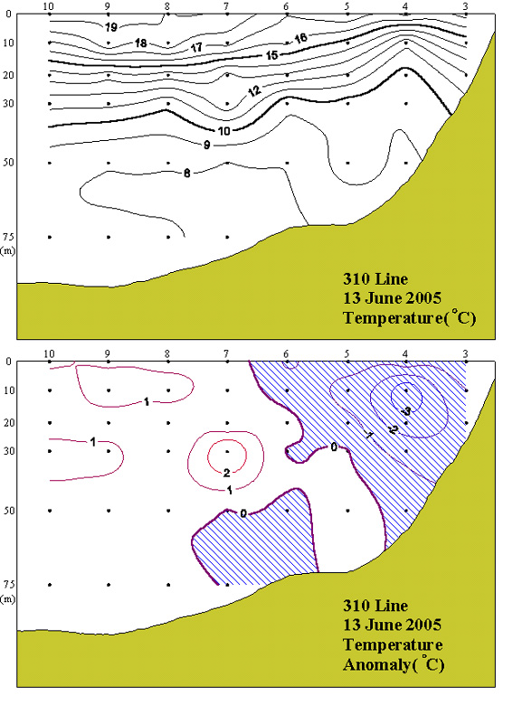◦ 2005년 04월 16일 국립수산과학원 서해수산연구소에서 조사한 310선 (영광 서방)의 수직수온분포도 및 평년편차도 입니다.