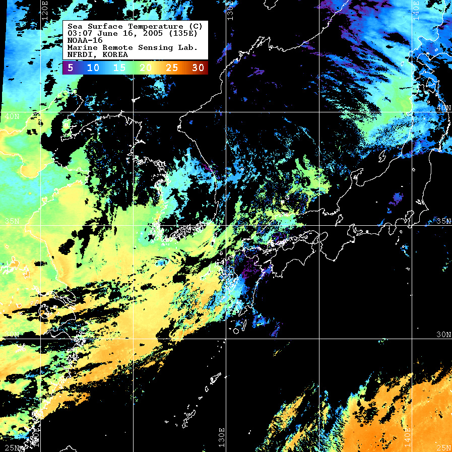 o 2005년 06월 16일 03시 07분 NOAA-16호 위성영상입니다. o 수온분포는 범례를 참고하시기 바랍니다. o 검은색은 구름 또는 육지를 나타냅니다.