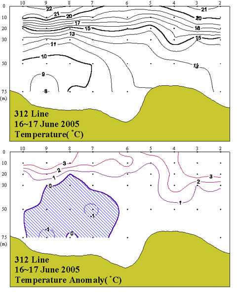◦ 2005년 6월 16~17일 국립수산과학원 서해수산연구소에서 조사한 312선(제주해협 서방)의 수직수온분포도 및 평년편차도 입니다.