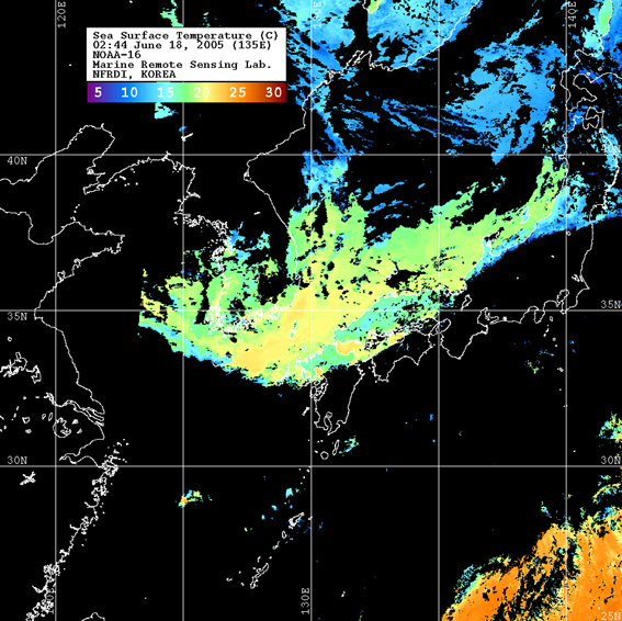 o 2005년 06월 18일 02시 44분 NOAA-16호 위성영상입니다. o 수온분포는 범례를 참고하시기 바랍니다. o 검은색은 구름 또는 육지를 나타냅니다.