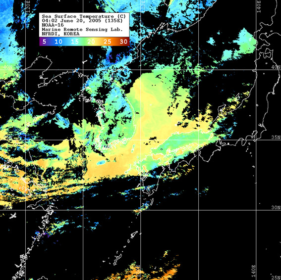 o 2005년 06월 20일 04시 02분 NOAA-16호 위성영상입니다. o 수온분포는 범례를 참고하시기 바랍니다. o 검은색은 구름 또는 육지를 나타냅니다.