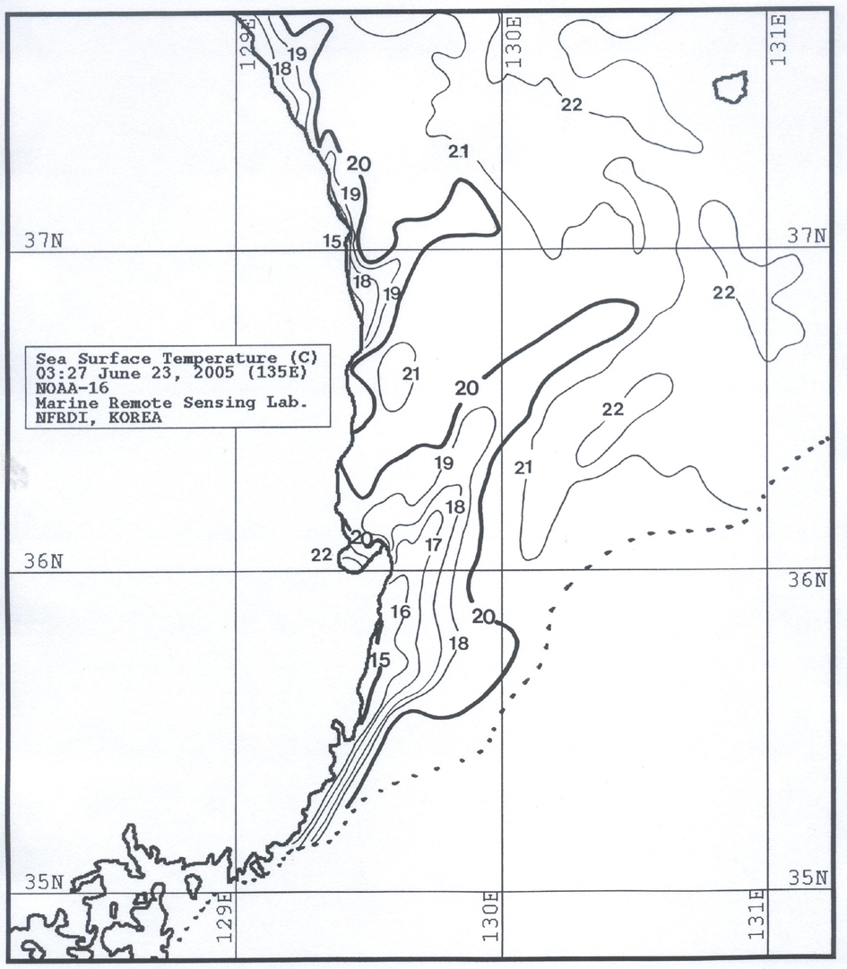 o 2005년 6월 23일 오전 10시 현재 동해남부 연안정지 관측점에서 관측한 수온은 기장 섭씨 15.4도, 일광 15.2도, 감포 14.5도, 울진 15.5도로 주변의 정상수온 20도에 비해 5도 이상 차게 나타나고 있습니다.