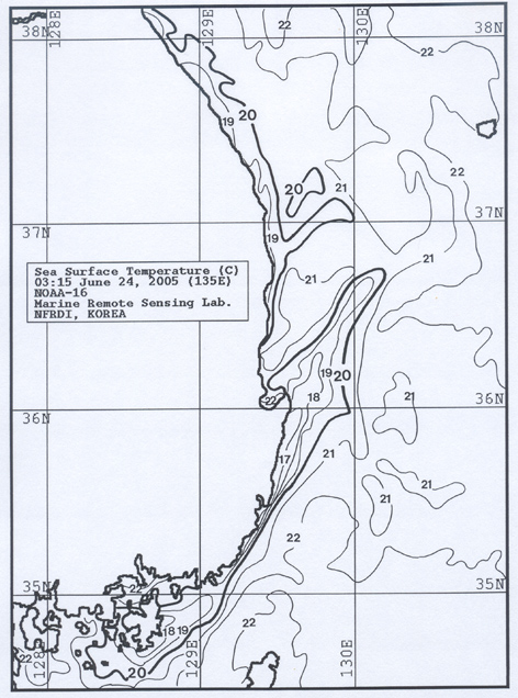 o 2005년 6월 24일 오전 10시 현재 동해남부 연안정지 관측점에서 관측한 수온은 기장 섭씨 17.2도, 일광 15.0도, 울기 16.8도, 감포 16.8도, 울진 15.9도로 주변의 정상수온 20∼22도에 비해 5도 이상 차게 나타나고 있습니다. o 아래 그림은 NOAA위성 열감지기가 관측한 수온분포도입니다. o 동해남부 연안에 발생한 냉수대 주변수온은 16∼18도로 나타납니다. < 위의 그림을 클릭하시면 확대된 수온정보를 보실 수 있습니다 >